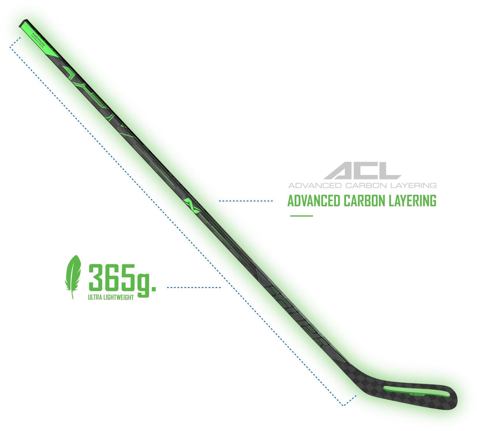 Not only is this the lightest nexus stick ever created but it is also loaded with a revolutionary technology that will give players a level of confidence they have never experienced when shooting the puck. How did they do this. Advanced carbon layering er spine tech combine to create bauer s lightest nexus stick ever. This is the bauer nexus adv.